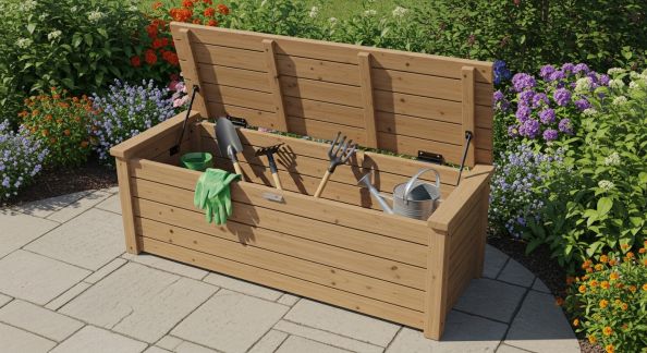 Un simple coffre ou une caisse à outils peut suffire, contre un mur ou dans un abri, avec étagères ou crochets pour suspendre les manches.